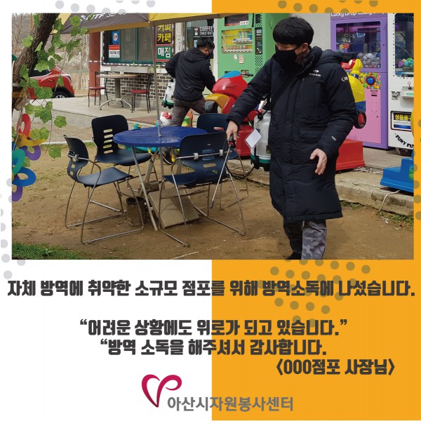 충남 | 충남지부 아산시지회'코로나19' 바이러스 방역 봉사 활동(2020년 4월 1일) 페이지 정보 작성자 박종원 작성일20-04-03 13:12 조회15,854회 댓글0건 관련링크 이전글 다음글 목록 본문 아산시 도고면 아산서부 종합사회복지관아산시 도고면 해비타트 지역아동센터아산시 도고면 행정복지센터아산시 선장면 행정복지센터아산시 신창면 구세군지역 아동센터아산시 신창면 미래지역 아동센터아산시 신창면 소상공인영업장 샘마을마트아산시 신창면 신창지역 아동센터아산시 신창면 아산사랑의지역 아동센터아산시 신창면 행정복지센터 1. 일 시 : 2020년 04월 01일(수요일) 2. 장 소 : 아산시 도고면, 선장면, 신창면 內 지역아동센터, 면사무소, 소상공인 영업장3. 내 용 : '코로나19' 바이러스 방역 소독 활동 이전글 다음글 목록