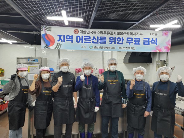 울산 | [울산지부] 41주차 무료급식 활동 페이지 정보 작성자 김남일 작성일25-03-06 16:03 조회896회 댓글0건 관련링크 이전글 다음글 검색 목록 본문 울산지부 41주차 무료급식 활동 울산지부는 금일 지역 저소득층 어르신을 위한사회공헌활동으로 무료급식활동을 하였습니다.지부장,부지부장, 사무처장은 본회 주관 비젼수립워크숍 참석으로불참하였습니다.봉사활동에 참여해주신 지부선후배님들께 감사드립니다. - 아 래 -행사명 : 41차 무료급식일 시 : 3월 6일 (오전 8시~12시 /목요일)장 소 : 특수임무유공자회울산지부 무료급식소 이전글 다음글 검색 목록